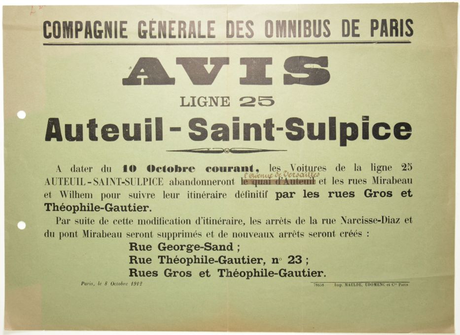 | Lot 1712 | Category: French & French Colonial Paperwork & PublicationsCompagnie Generale des Omnibus de Paris, Avis Ligne 25 Auteuil - Saint-Sulpice (Notice Line 25 Auteuil - Saint-Sulpice), details of route alteration, 8th October 1912, single sheet, folded. |