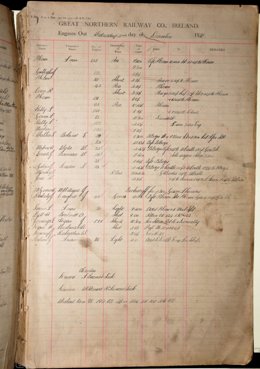 Category: Locomotive Working & RecordsGNR of Ireland, Engines Out ledger, 2nd December 1936-30th July 1937, lists all engine numbers, driver and firemen's names, journeys and remarks, a substantial volume, though lacking board covers and spine. Also, local traffic distances notice. | |