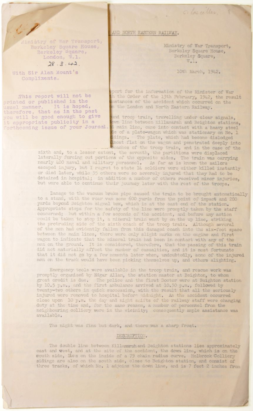 Category: Accident ReportsLNER, Killamarsh and Beighton, 13th February 1942, five typescript sheets. £20 | |