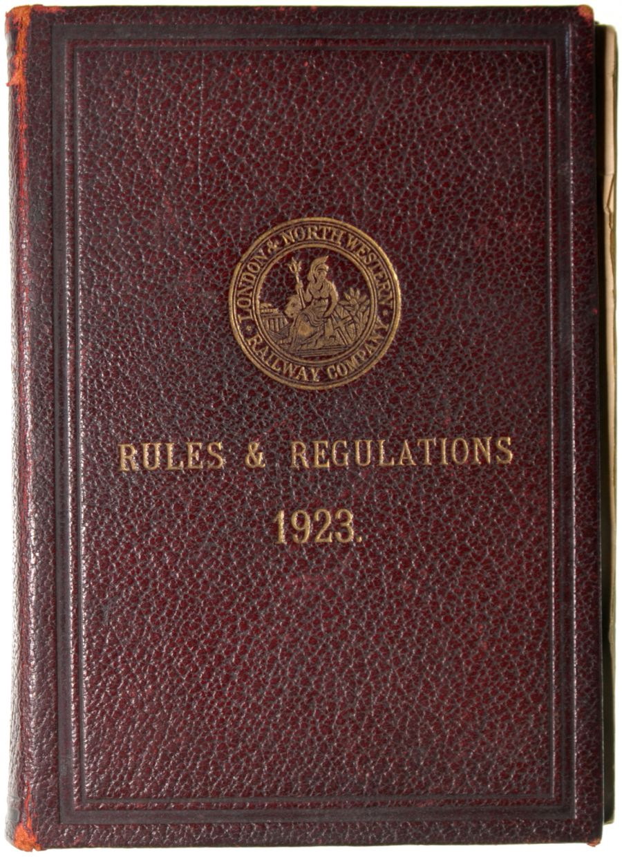 Category: Rule BooksLNWR, 1923, leather bound, gilt coat of arms, internal split to binding. | |