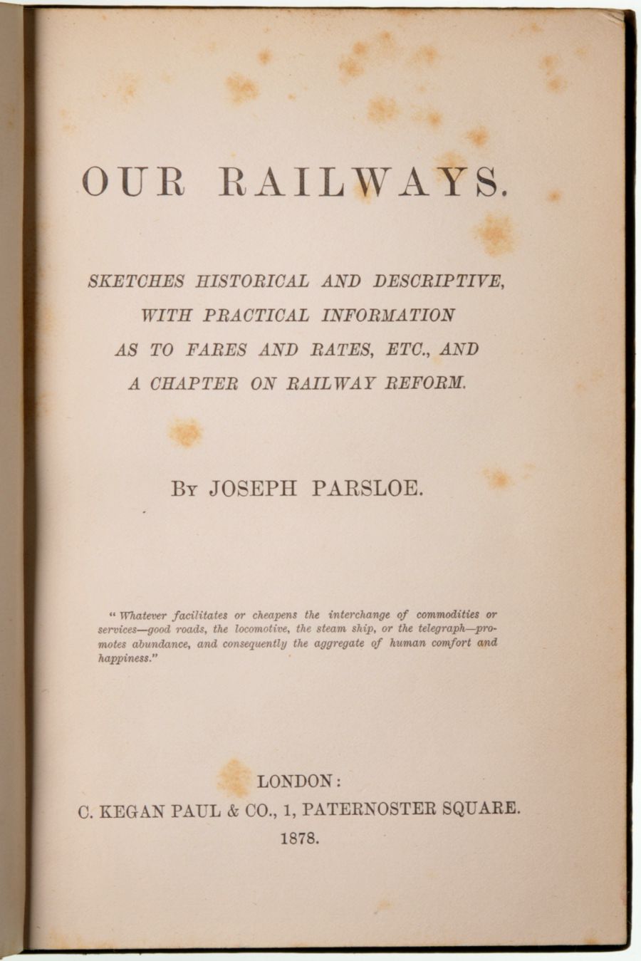 Category: Books (Single)Our Railways, J Parsloe, Kegen Paul, 1878, leather bound, gilt coat of arms, Wesleyan Collage Taunton prize, wear to top of spine. | |