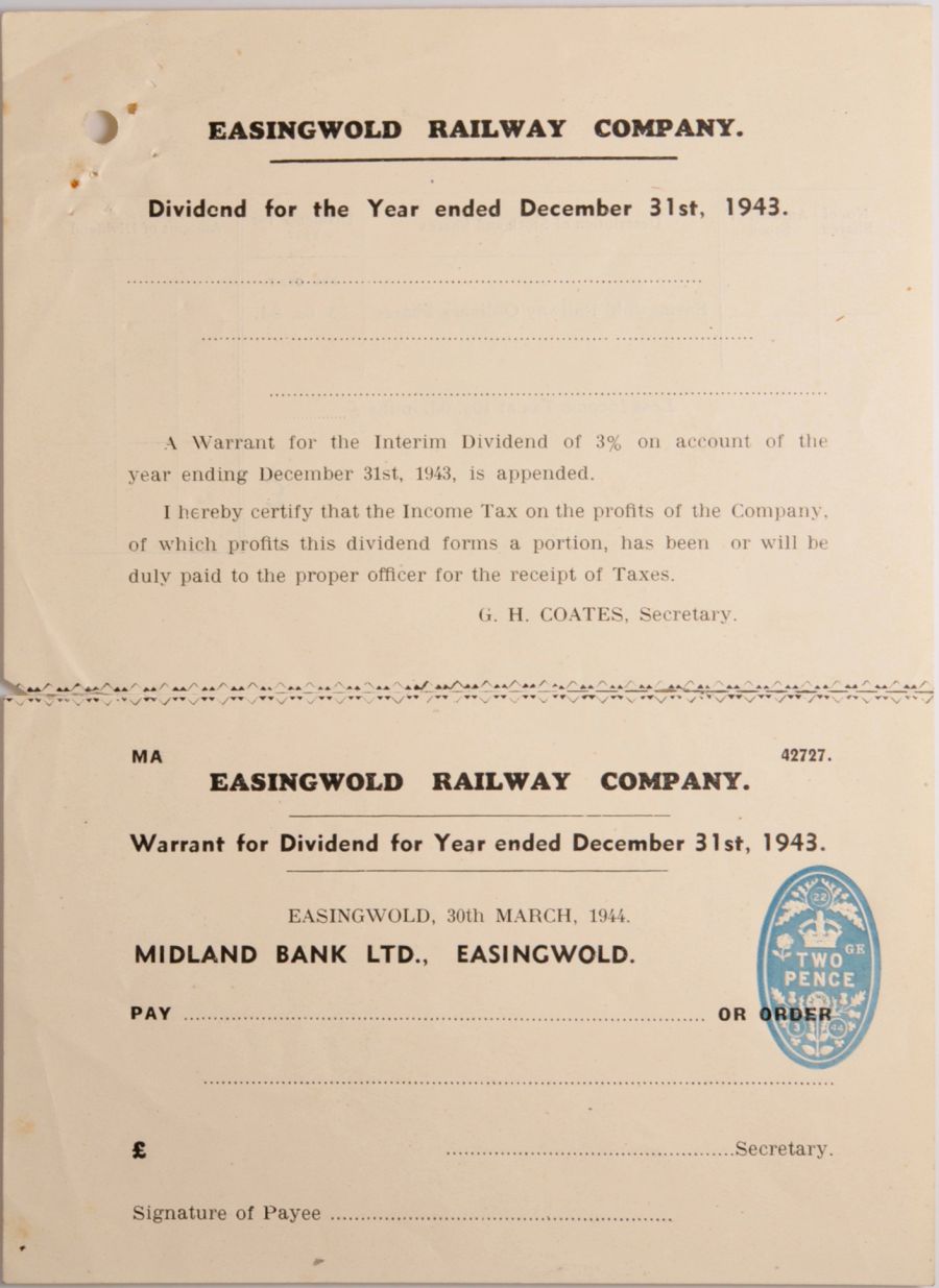 Category: Share CertificatesEasingwold Railway, unused Dividend Statement, 1943. | |