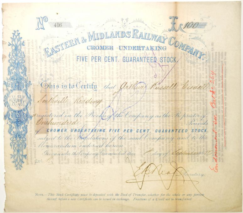 | Lot 351 | Category: Share CertificatesEastern and Midlands Railway, Cromer Undertaking, 5% Guaranteed Stock, £100, 1st September 1886, with seal. |