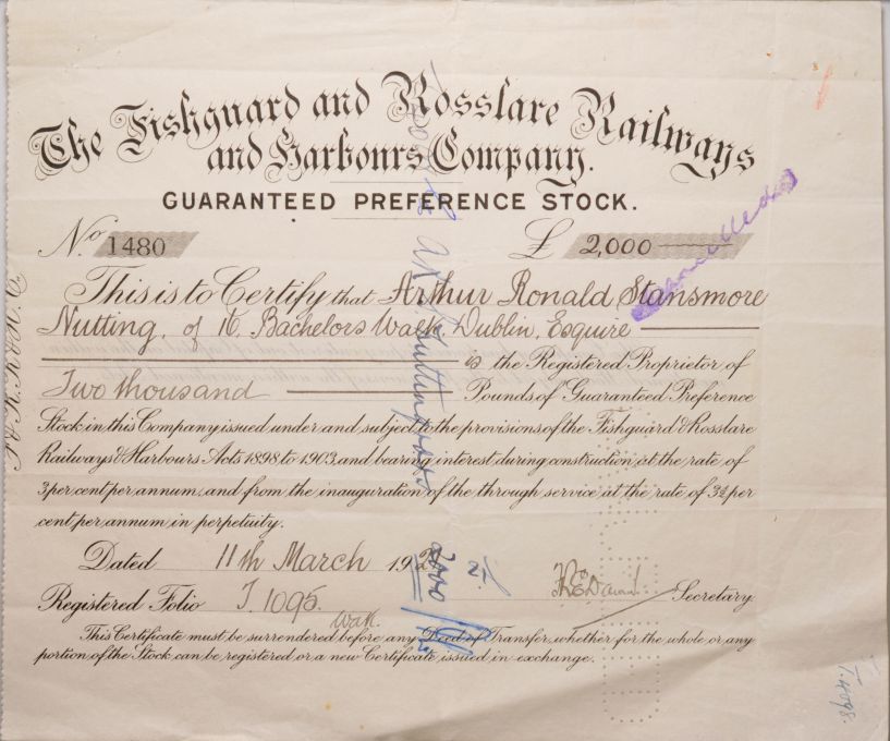 | Lot 352 | Category: Share CertificatesFishguard and Rosslare Railways and Harbours, Guaranteed Preference Stock £2000, 11th March 1921. |