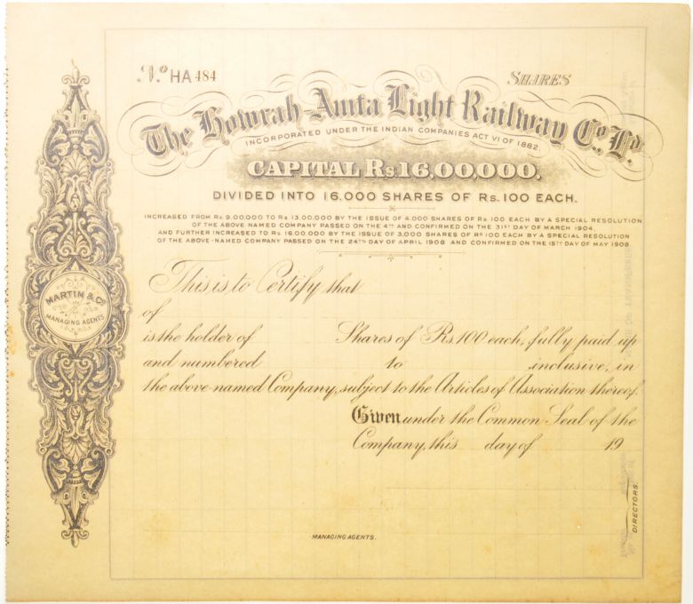 | Lot 357 | Category: Share CertificatesHowrah-Amta Light Railway, Rs100 Share, unused. |