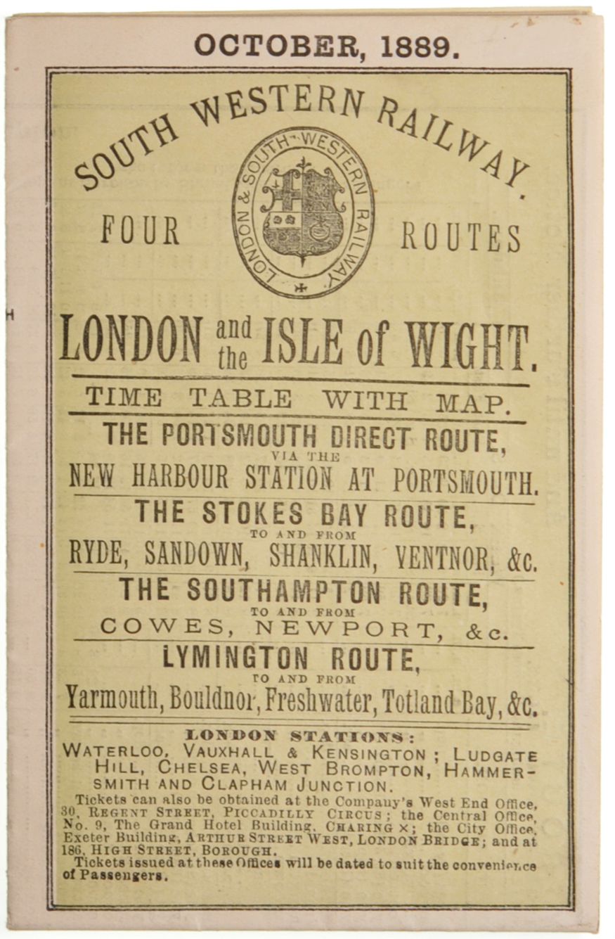 Category: Timetables (Public)LSWR pocket timetable, London and Isle of Wight, October 1889. | |