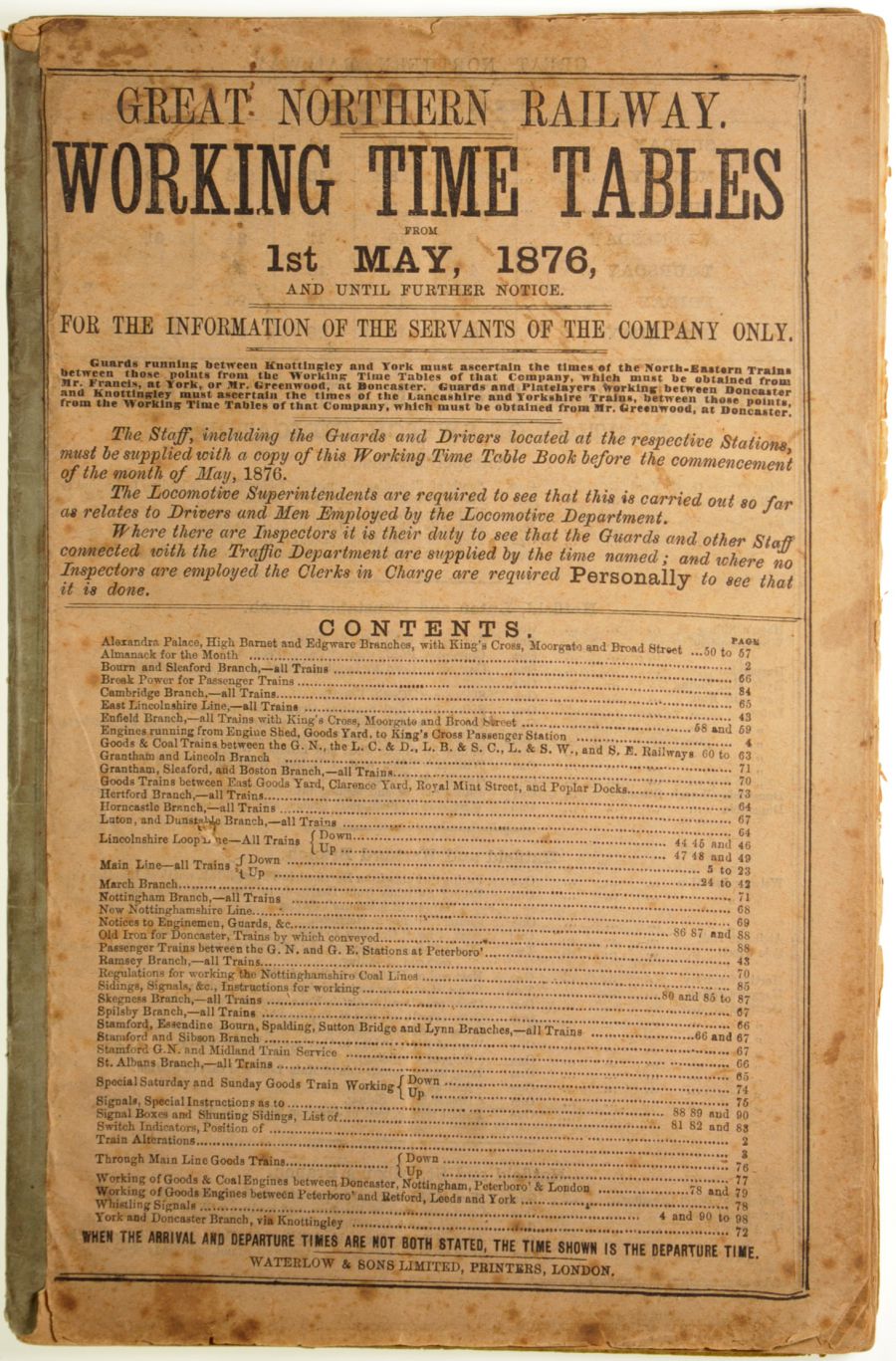 Category: Timetables (Working)GNR, 1/5 1876, 96pp, cover worn,, page 81/82 detached but present. £40 | |