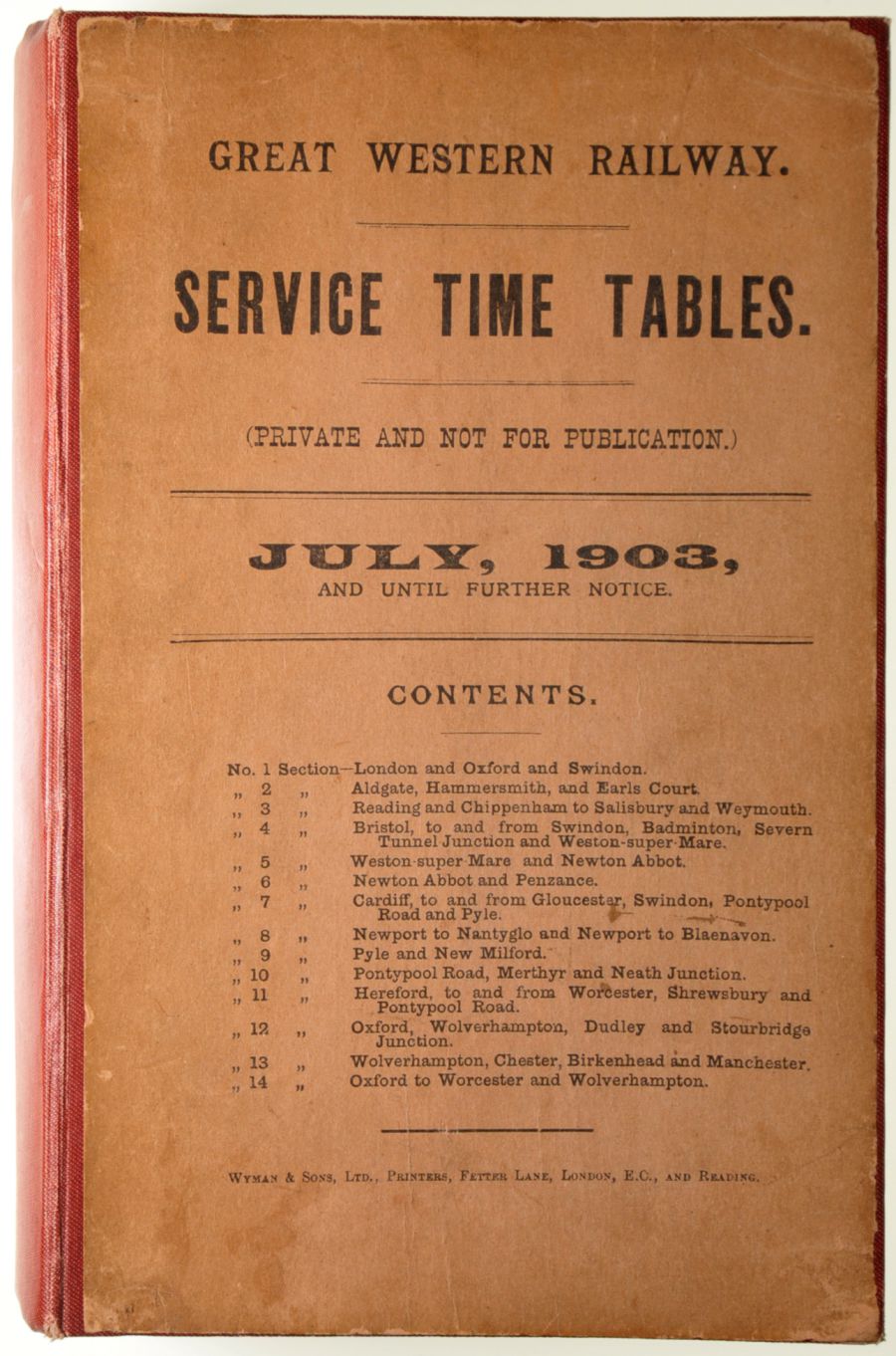 Category: Timetables (Working)GWR, July 1903 u.f.n, Sections 1-14, within a single bound volume, 3" thick. | |
