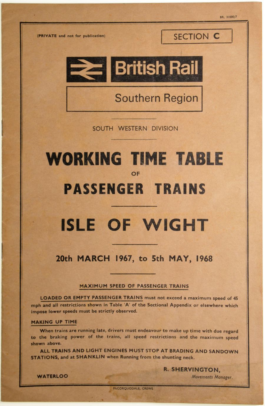 Category: Timetables (Working)BR(S), IOW, 20/3 1967 - 5/5 1968, 15pp, cover marked. | |