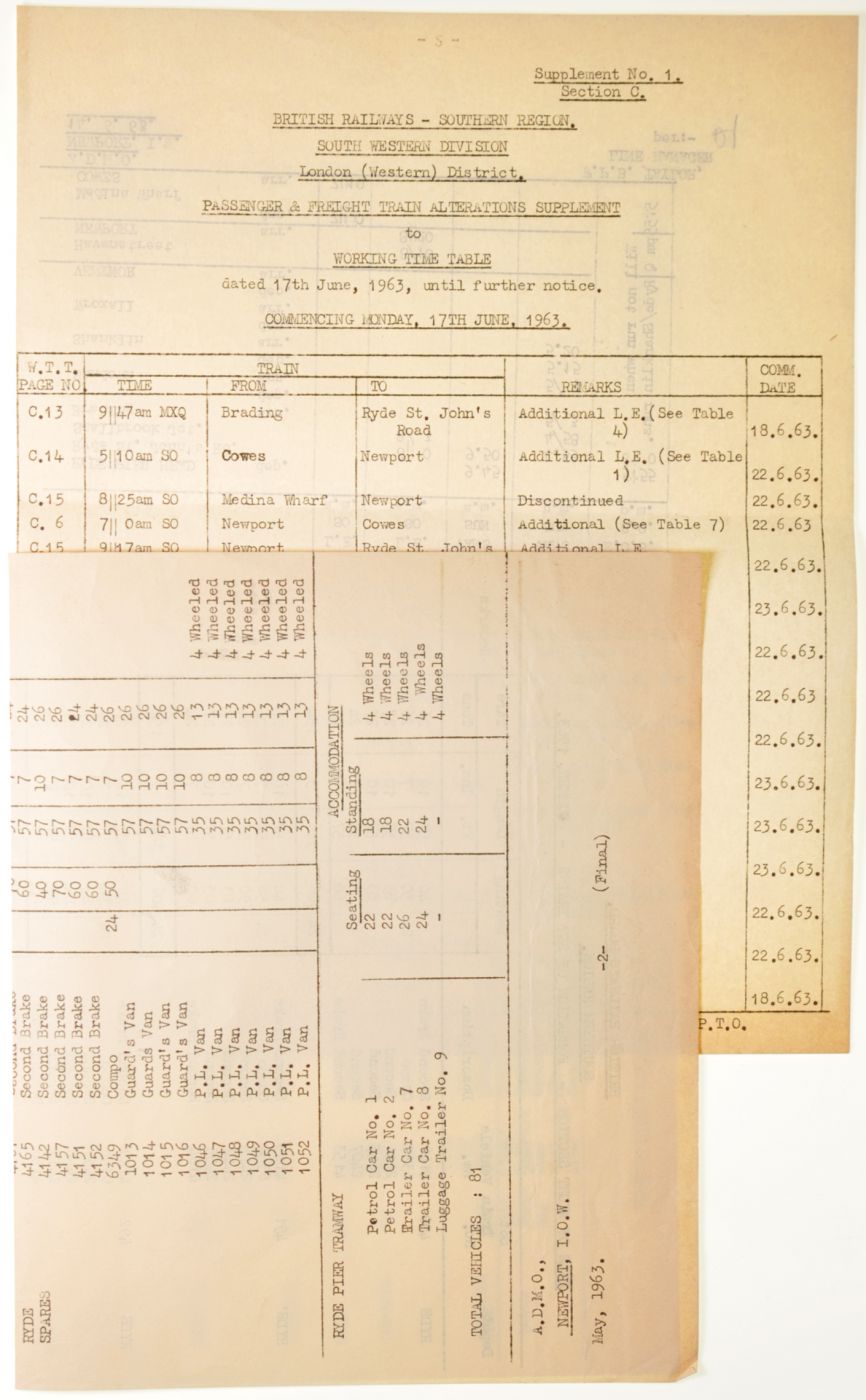 Category: Carriage Working & RecordsBR(S), IOW Section, Formation Of Set Trains, Ryde Depot, Summer 1963, Newport Depot formations on reverse, also Ryde Pier Tramway, lists all coach numbers and train set numbers. Also, passenger and freight alterations to WTT 17th June 1963. Both double-sided typescript. (2) | |