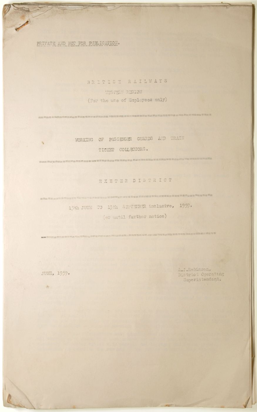 Category: Carriage Working & RecordsBR(W), Working Of Guards And Ticket Collectors, Exeter District, June 1959, 28pp. | |
