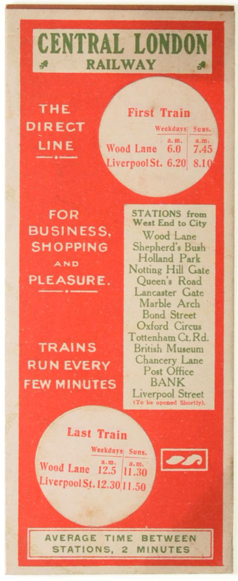 Category: Publicity MaterialCentral London Railway, folding map of the line, Ealing Broadway to Liverpool Street, January 1912. | |