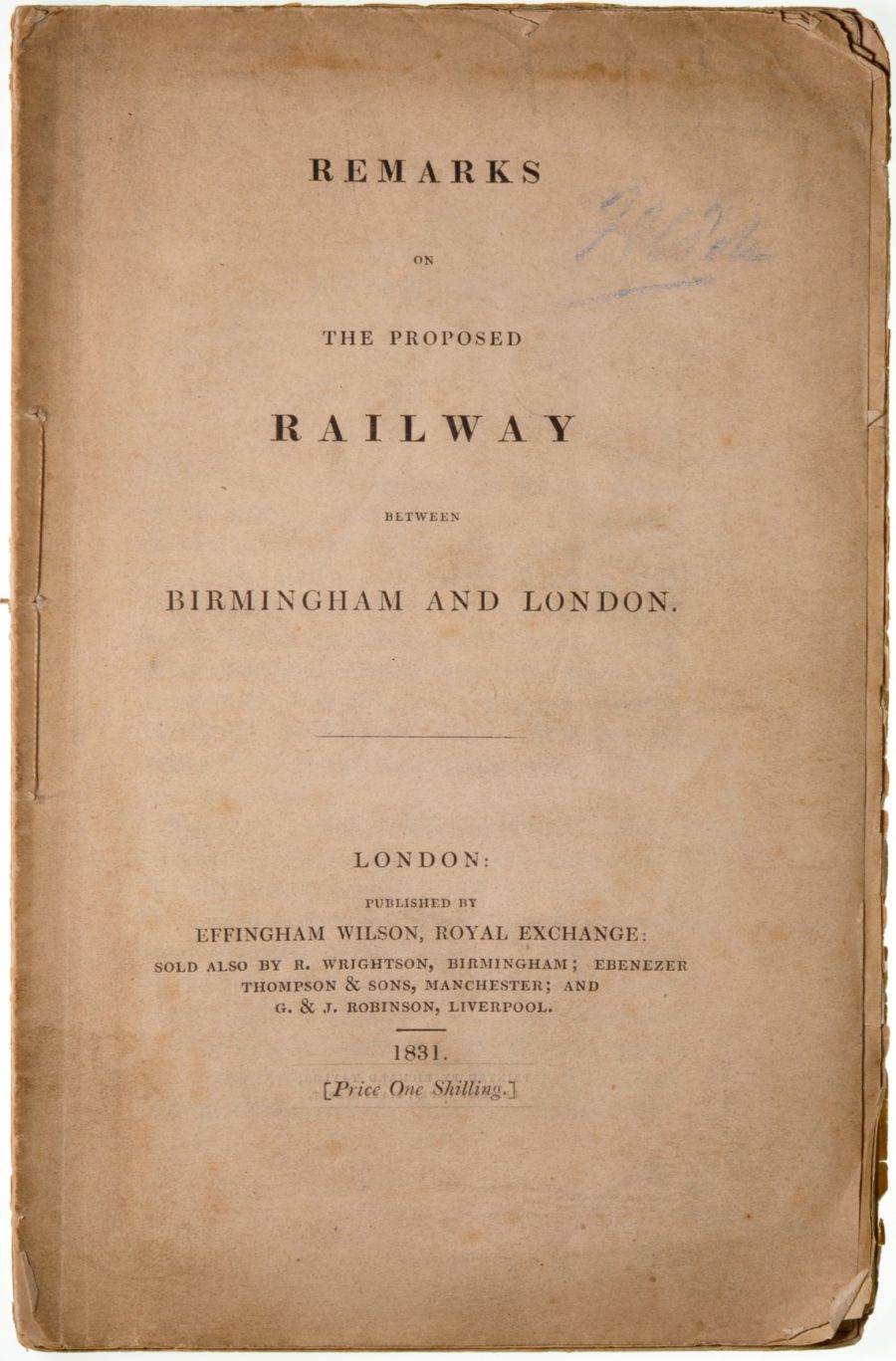 Category: Books (Single)Remarks On The Proposed Railway Between Birmingham And London, Effingham Wilson, 1831, 31pp booklet, a little edge wear. | |