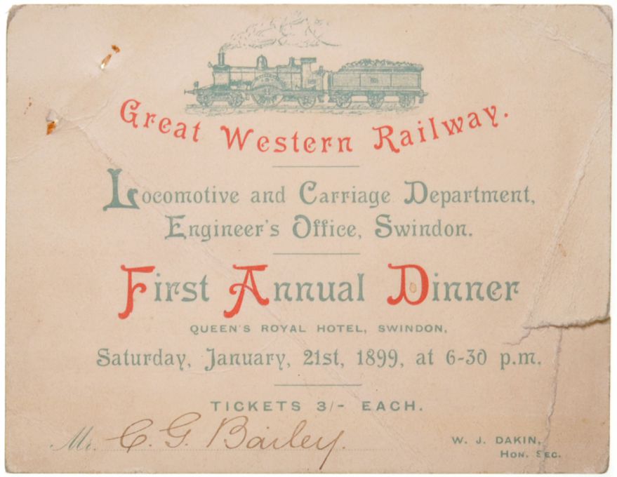 | Lot 629 | Category: Publicity MaterialGWR Invitation, Loco and Carriage Dept, First Annual Dinner, 1899. Vignette of contemporary engine, damage to right side and some wear. |