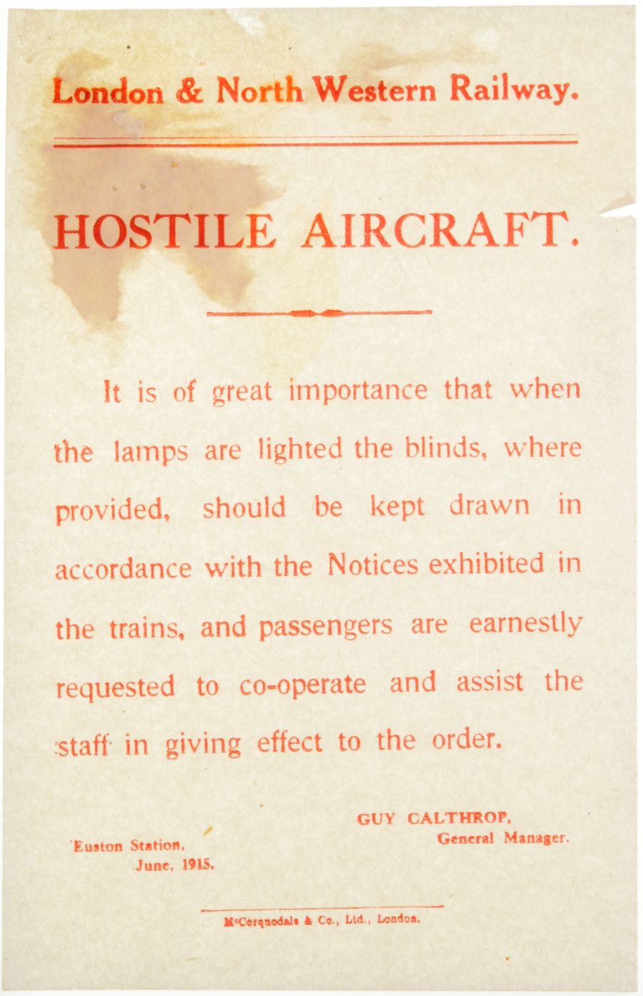 Category: Publicity MaterialLNWR notice, Hostile Aircraft, Keep Blinds Down, 1915. Paper on the back. | |