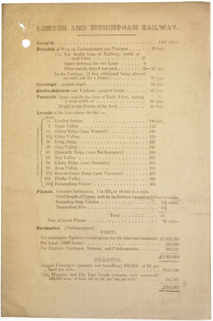Category: Publicity MaterialLondon and Birmingham Railway, list of specifications for the route and costs. A little dusty. | |