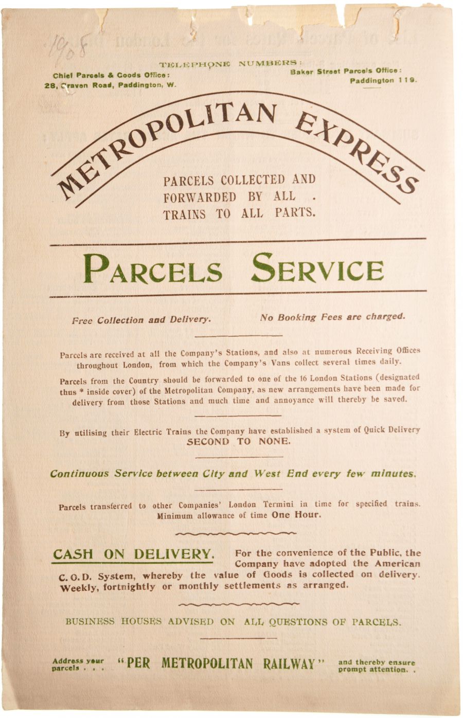 Category: Publicity MaterialMetropolitan Express Parcel Service, listing stations served, 4pp, wear to edges. | |