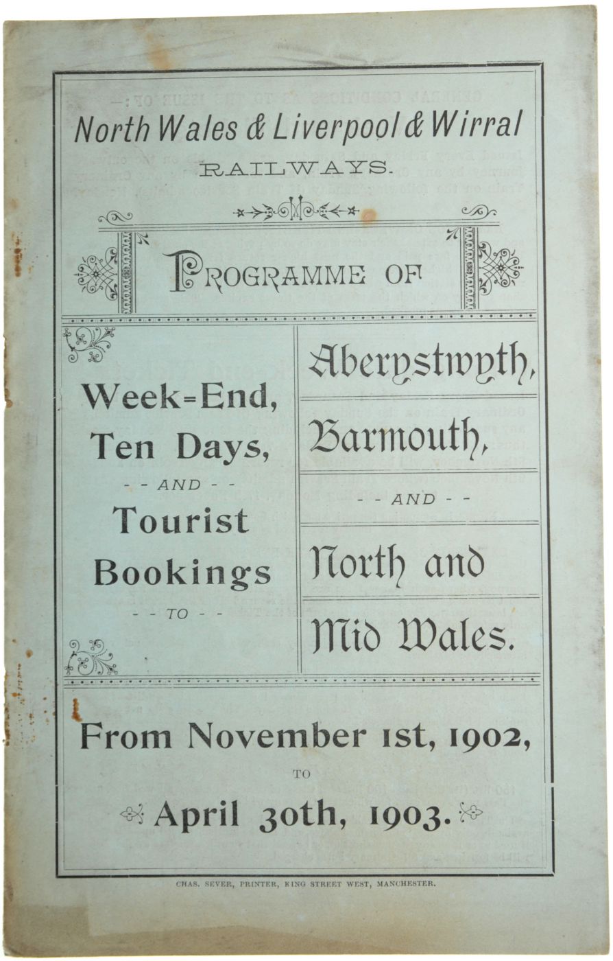 Category: Publicity MaterialNorth Wales and Liverpool and Wirral Railways, Tourist Programme, Winter 1902-03, 8pp, covers marked, rusty staples removed. | |