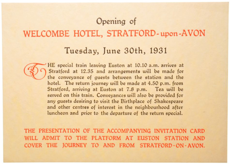 | Lot 913 | Category: Publicity MaterialLMS, Welcombe Hotel Opening, 30th June 1931, invitation for special train from Euston, attractive printed card. |