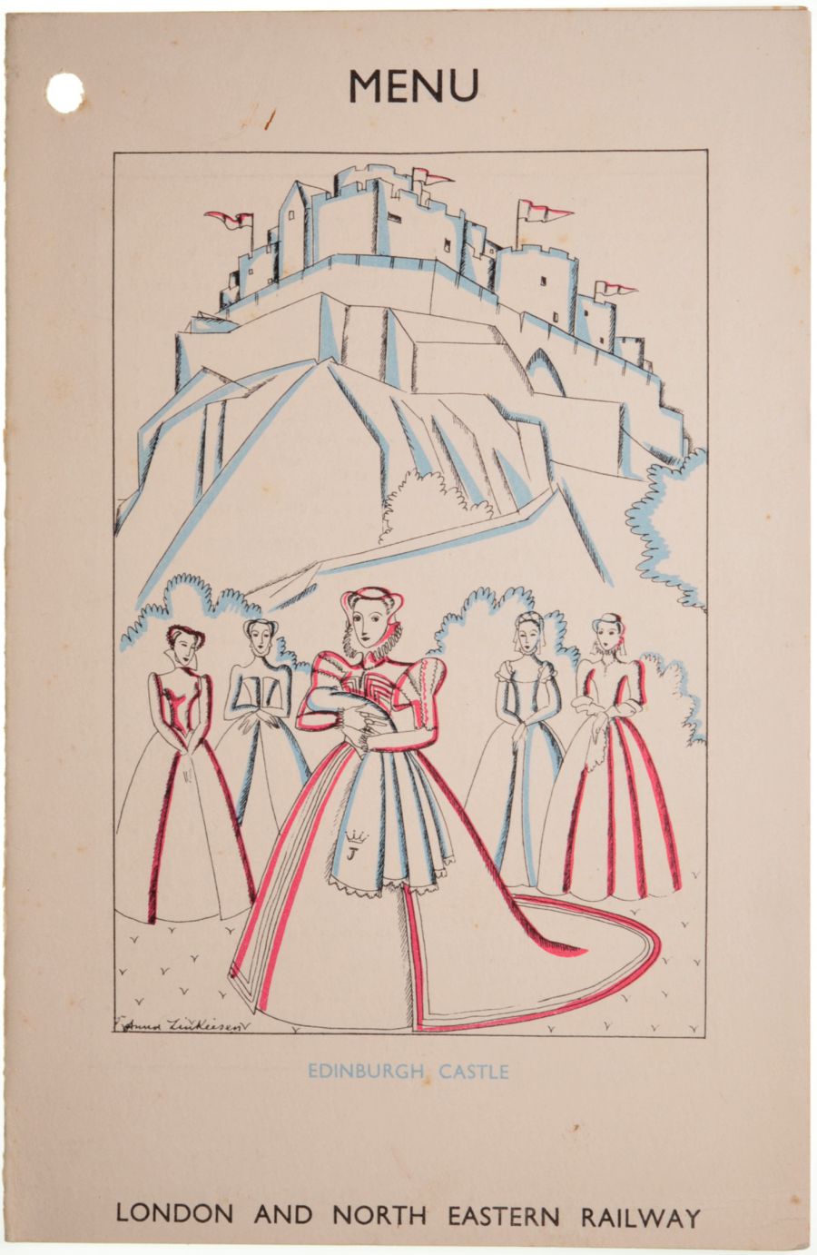 Category: MenusLNER, Dinner, 5.30 p.m, Cromer to Liverpool Street, 5th January 1935, cover features artwork of Edinburgh Castle, by Anna Zinkiensen. | |