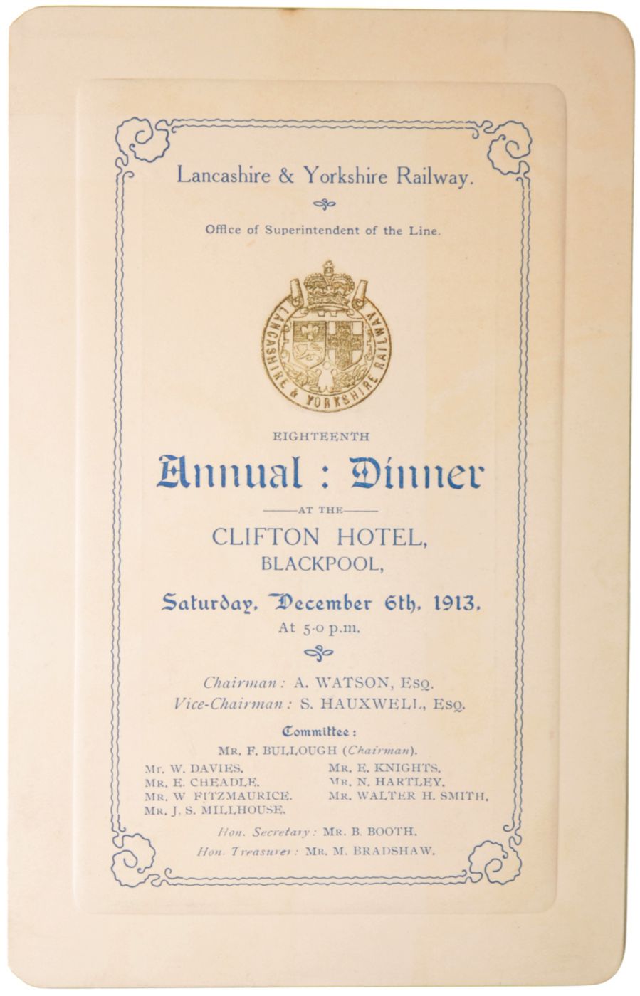 Category: MenusLYR Annual Dinner, Clifton Hotel, Blackpool, December 6th 1913, folding card with programme, mount mark on top of back cover, away from text. | |